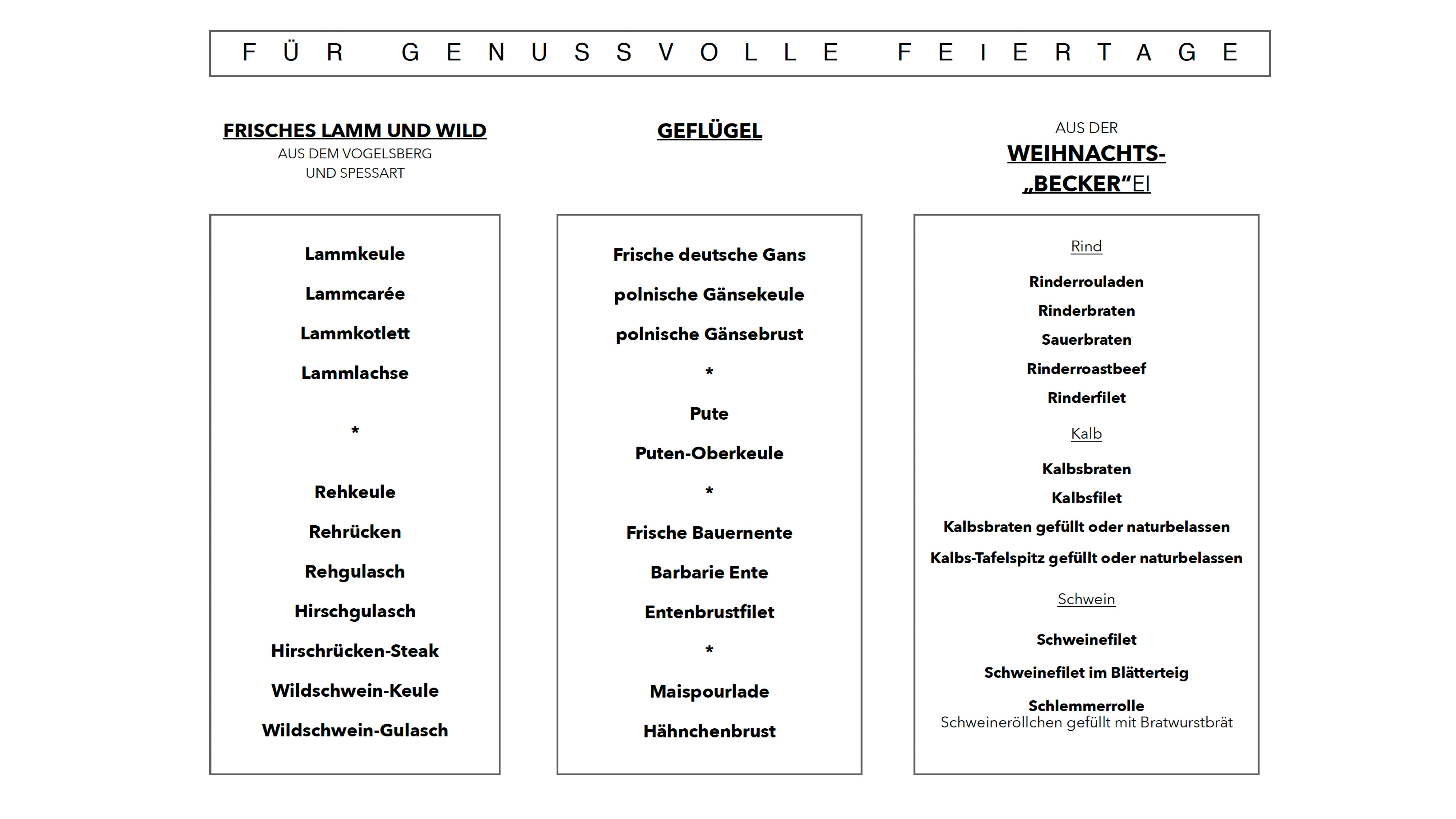 Bestellen Sie für genussvolle Feiertage Ihre Leckereien für Weihnachten bei uns vor – wir kochen vor und Sie genießen. Außerdem Lamm und Wild, Geflügel sowie beste Stücke von Rind, Kalb und Schwein.