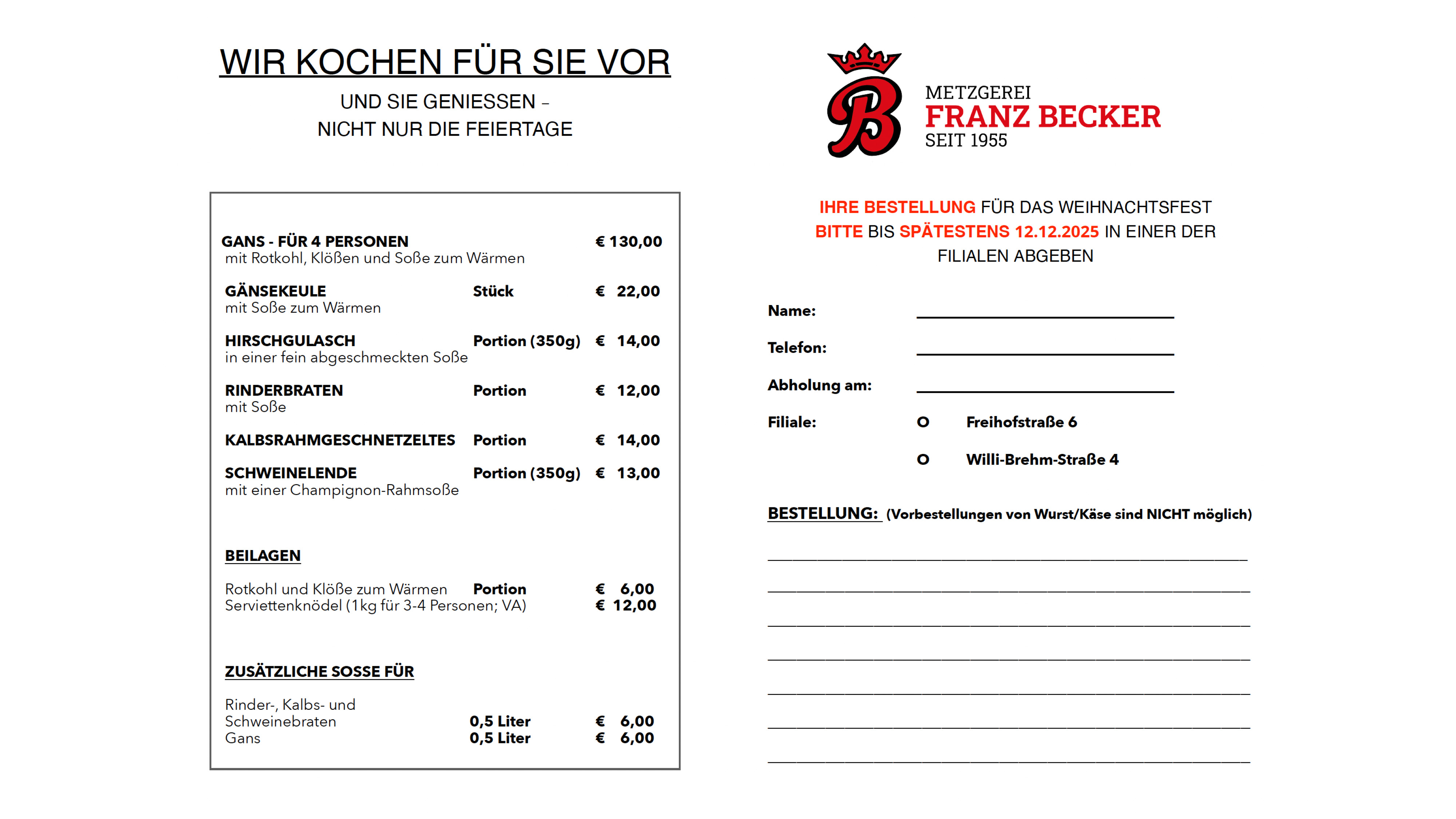 Bestellen Sie für genussvolle Feiertage Ihre Leckereien für Weihnachten bei uns vor – wir kochen vor und Sie genießen. Außerdem Lamm und Wild, Geflügel sowie beste Stücke von Rind, Kalb und Schwein.